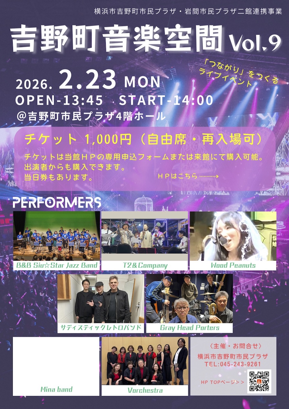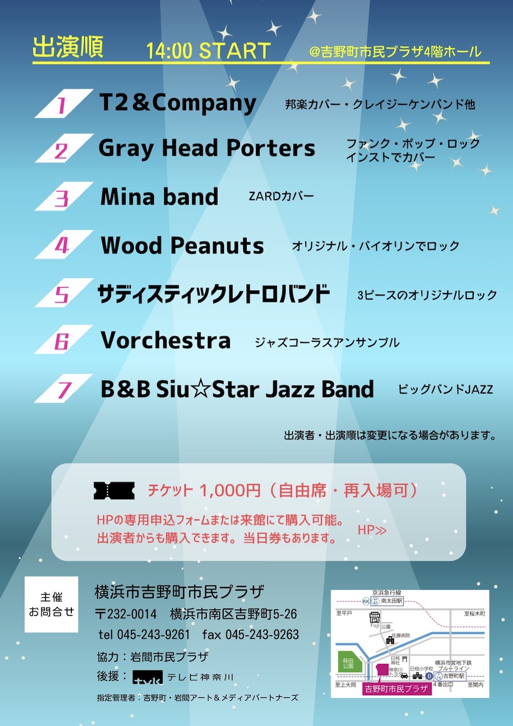Translate to English » ■「B&B Siu☆Star Jazz Band」本番 @ 吉野町音楽空間vol.9 ■ 2026年 2月23日(月.祝) ■ ジャンル:社会人ジャズビッグバンド (渡辺てつの生徒) ■ 会場:吉野町市民プラザ (最寄駅:吉野町/南太田) 4階ホール ■ 料金:¥1,000 ■ 備考:渡辺てつがディレクションする愉快な大人たちによる社会人ジャズビッグバンド「B&B Siu☆Star Jazz Band」の本番
