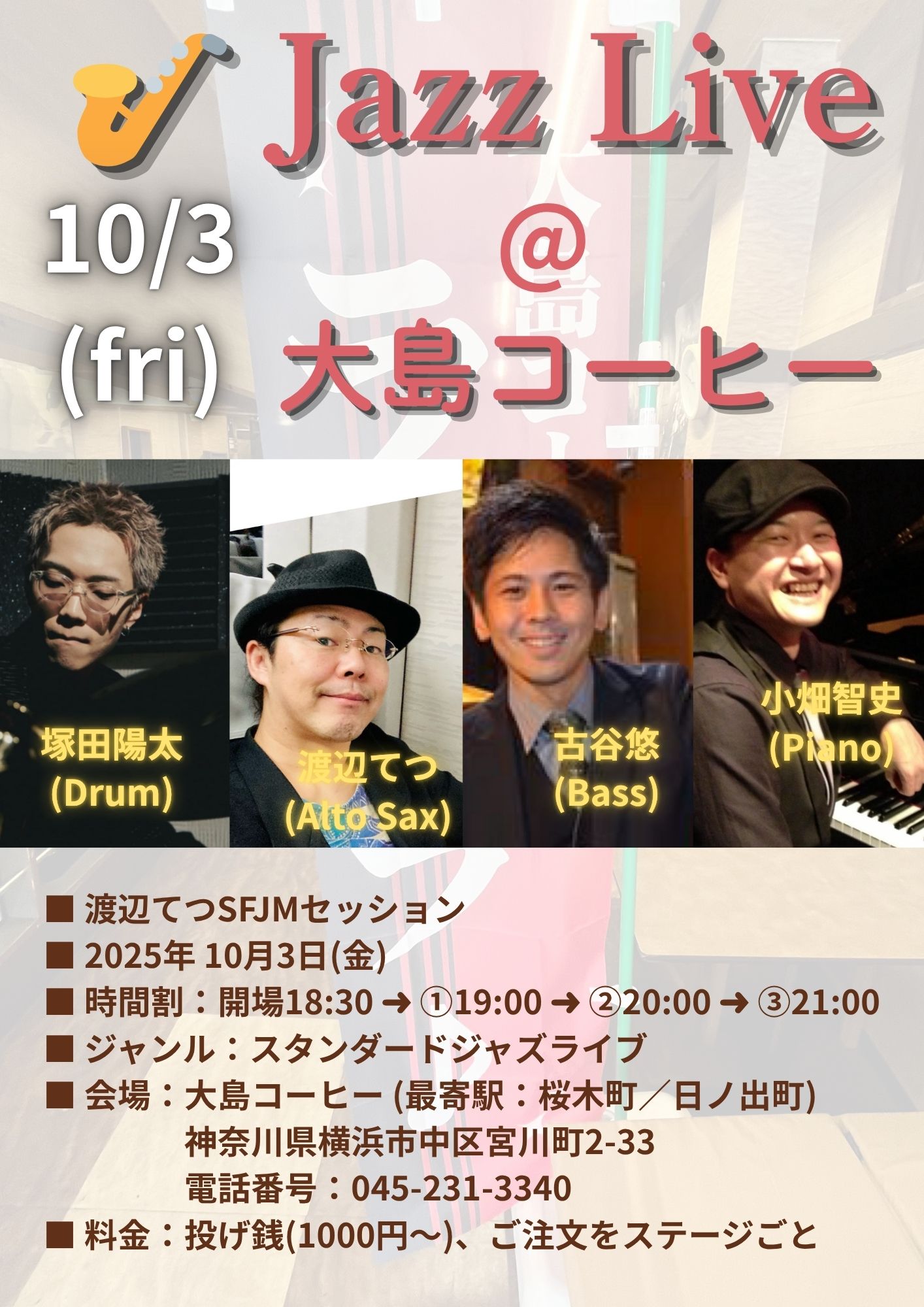 Translate to English » ■ 渡辺てつSFJMセッション @ 大島コーヒー ■ 2025年 10月3日(金) 開場18:30、演奏①19:00、②20:00、③21:00 (時間が変わりました。①18:30-19:20/演奏②19:40-20:30) ■ ジャンル:スタンダードジャズライブ ■ 会場:大島コーヒー (最寄駅:桜木町/日ノ出町) ■ 料金:投げ銭(1000円~)、注文をステージごとにお願いしております。