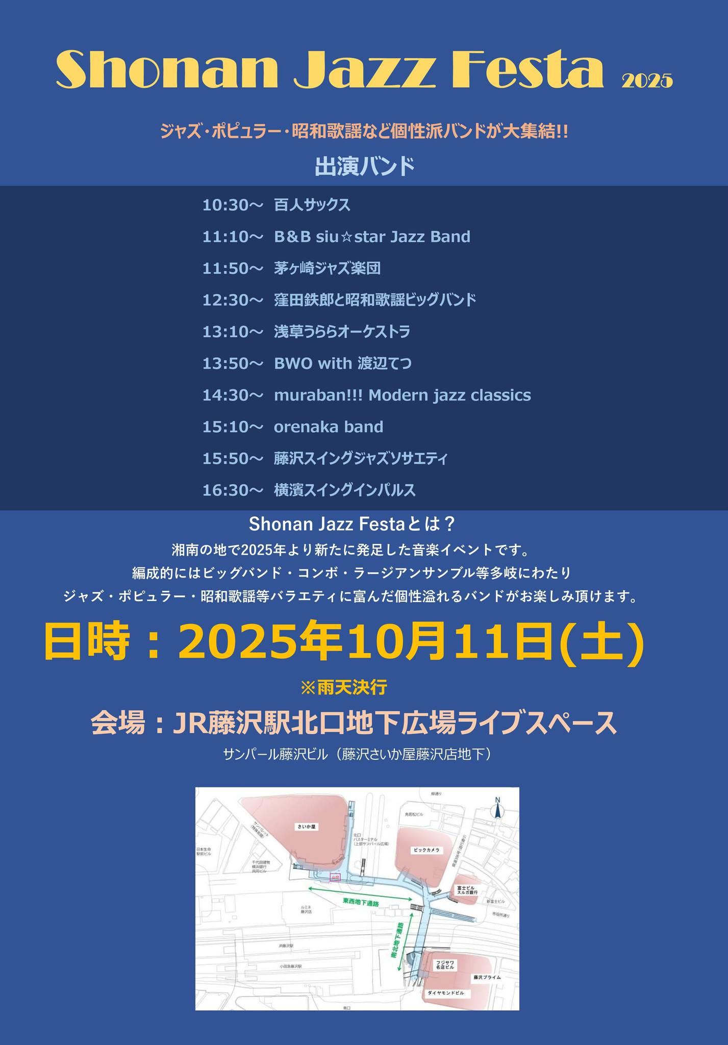 Translate to English » ■「B&B Siu☆Star Jazz Band」本番 @ Shonan Jazz Festa 2025 ■ 2025年 10月11日(土) 11:10-11:40演奏 ■ ジャンル:社会人ジャズビッグバンドの本番 (※ 渡辺てつの生徒の演奏です) ■ 会場:JR藤沢駅北口地下広場ライブスペース (最寄駅:藤沢) ■ 料金:無料 ■ 備考:渡辺てつがディレクションする愉快な大人たちによる社会人ジャズビッグバンド「B&B Siu☆Star Jazz Band」の本番です。 ■ 備考:今年からたちあがった新企画となります。