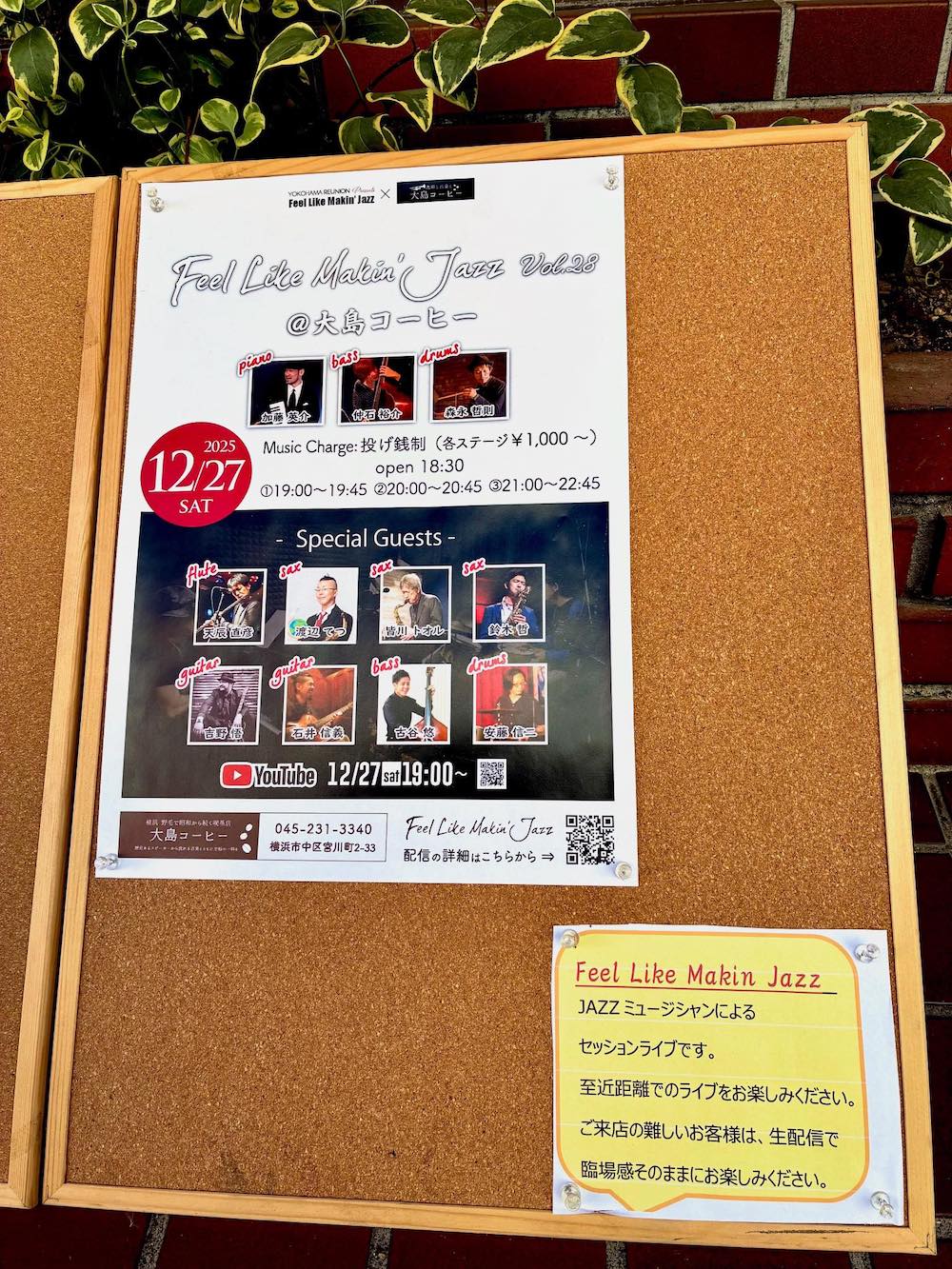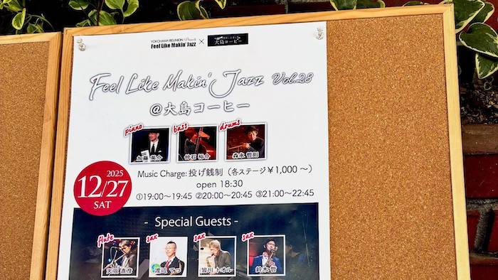 Translate to English » ■ [配信] Feel Like Makin' Jazz vol.28 ■ 2025年 12月27日(土) 19:00、20:00、21:00 ■ ジャンル:プロジャズミュージシャンによるJam Session ■ 会場:大島コーヒー (最寄駅:桜木町/日ノ出町) ■ 料金:チップ制