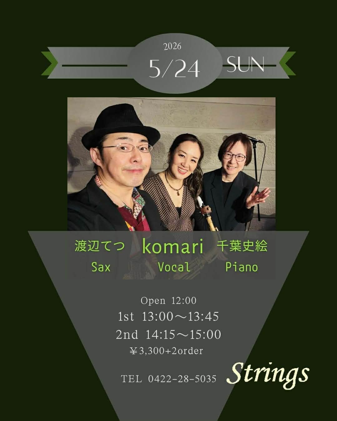 Translate to English » ■ komari jazz vocal Live "Autumun Jazz" @ strings ■ 2026年 5月24日(日) 開場12:00、演奏①13:00/演奏②14:15 ■ ジャンル:ジャズボーカルライブ ■ 会場:strings (最寄駅:吉祥寺) ■ 料金:3,300円 + 2オーダー